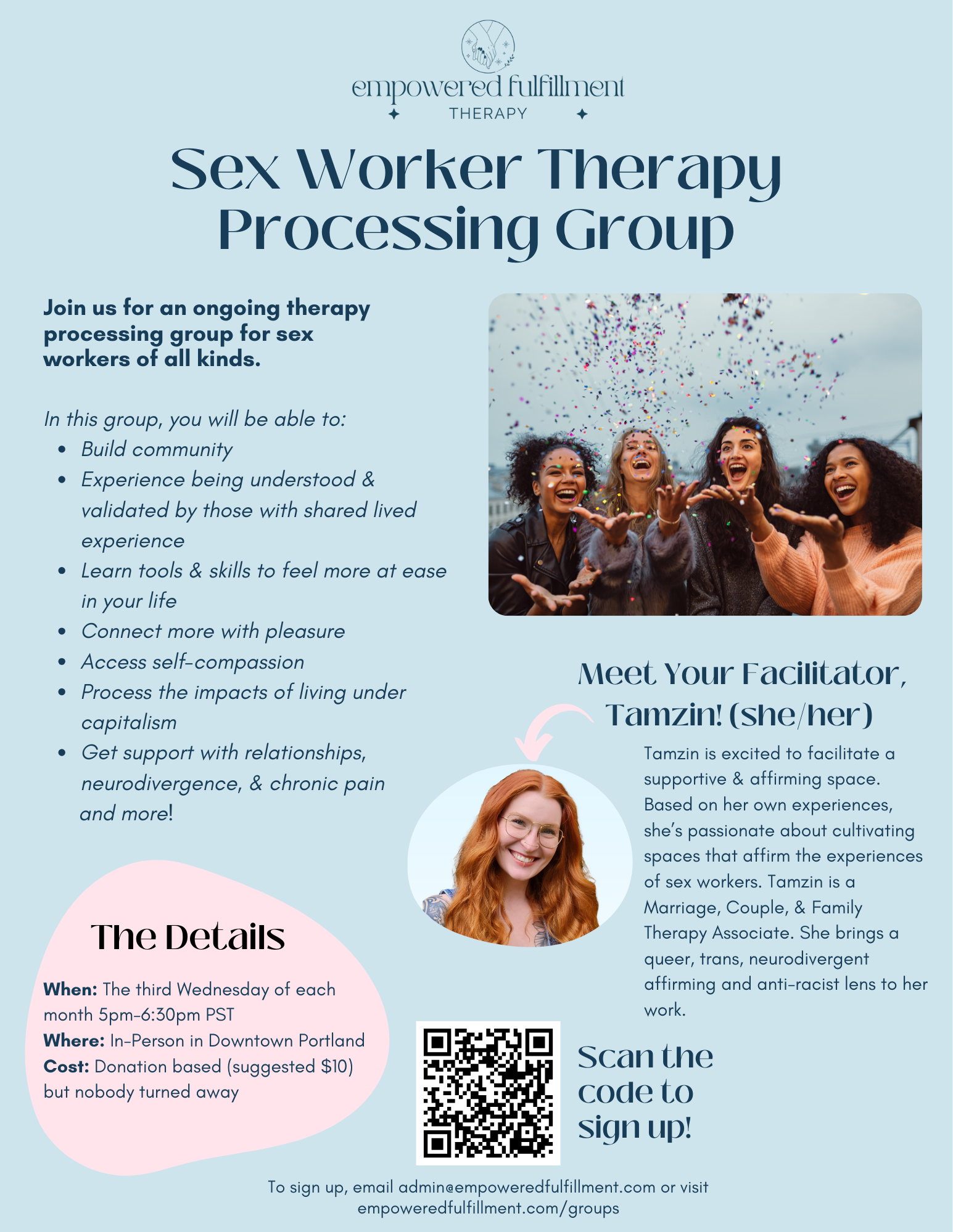 Are you a sex worker seeking a supportive space to process your experiences, build community and address challenges that may be impacting you? Join us in this SWer affirming group!